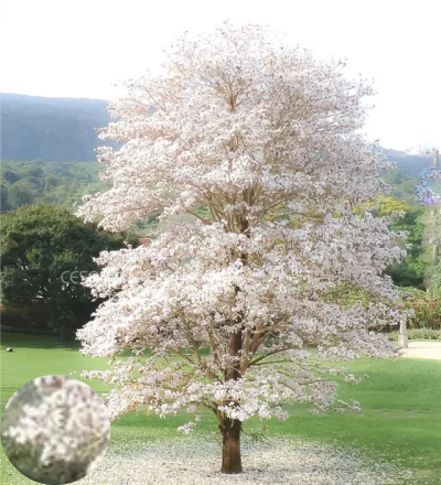 Características: Ipê Branco nome científico Tabebuia Róseo Alba, é uma árvore majestosa e ornamental, apreciada por suas belas flores brancas e sua robustez.